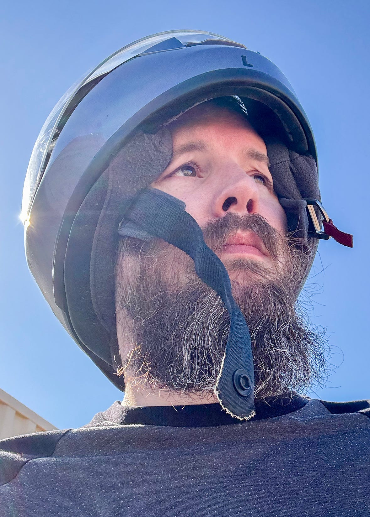 I have a beard and a mustache, and normally, I like to comb my facial hair out of my face and away from my mouth, but wearing a face shield completely prevented me from doing this. The facial padding on the inside of the helmet smashed all my facial hair into a weird space right in front of my mouth, which I wasn’t expecting.