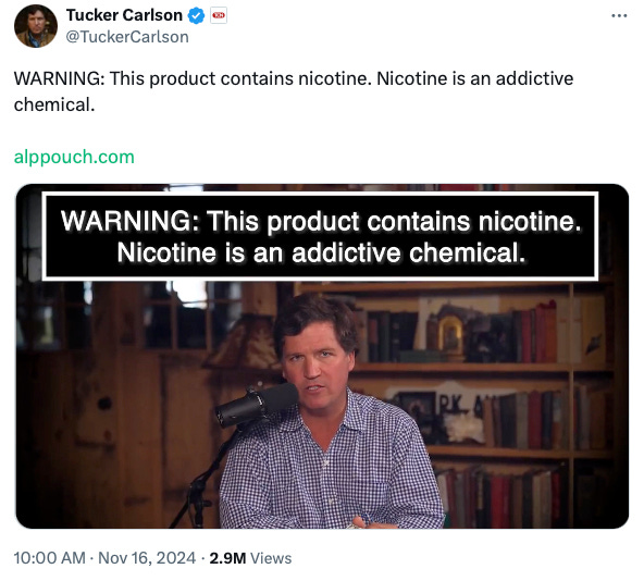 I haven’t noticed chewing tobacco or related products in the years since that evening until very recently. Smokeless tobacco products seem to be making a big splash, with companies like Zyn becoming hugely successful. Even Tucker Carlson recently started his own nicotine pouch company, and it seems like it’s becoming very trendy.