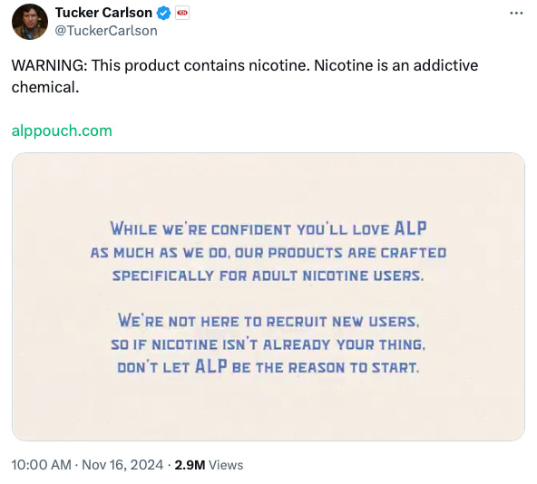 The other day, I noticed that at the end of one of his videos hawking ALP, there’s a disclaimer that says: “We’re not here to recruit new users, so if nicotine isn’t already your thing, don’t let ALP be the reason to start.”