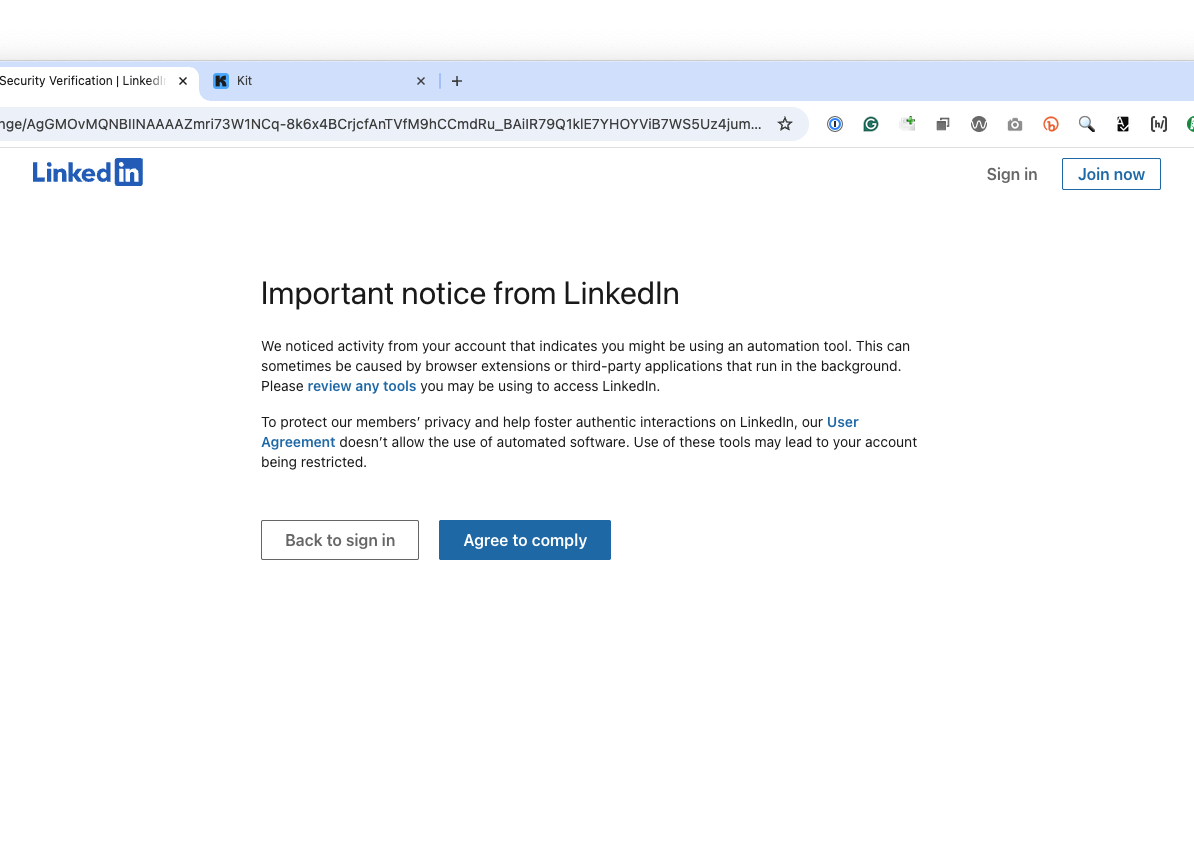 “We noticed activity from your account that indicates you might be using an automation tool…”