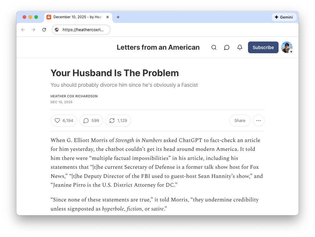 Pirate Wires just published a wild story about a marriage that finally collapsed after the wife mainlined the historian/writer/pundit Heather Cox Richardson every night.