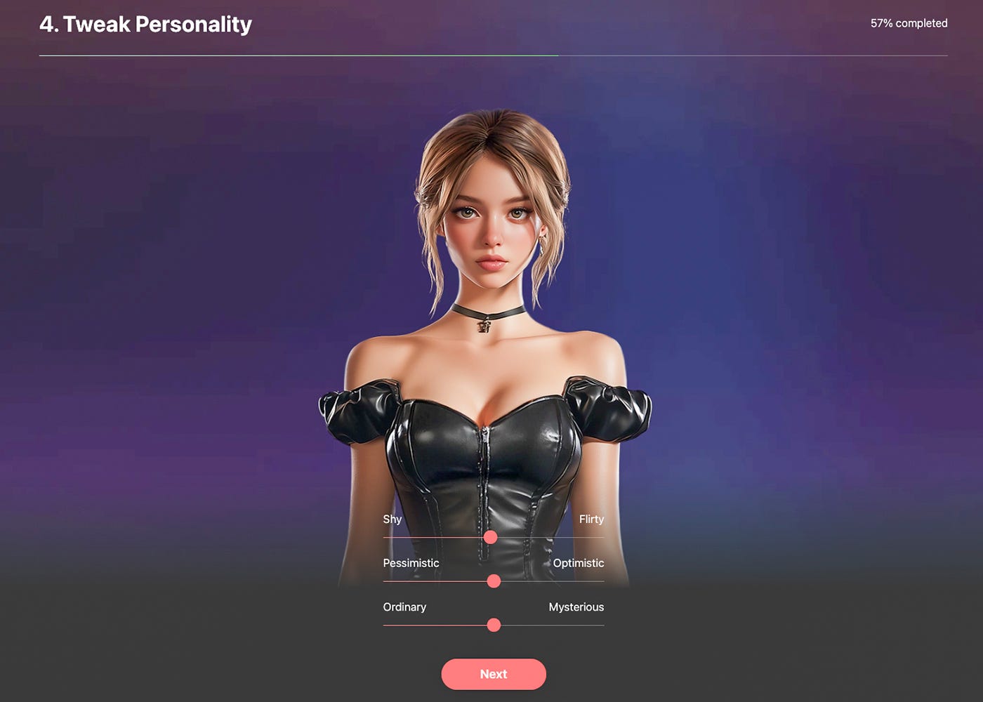 Today, as an exercise, I found a (non-pornographic) website and created an “iGirl” by simply clicking around a few times without creating an account. It started out by asking what I wanted her to look like, then it gave me a “tweak personality” section with sliders like this: